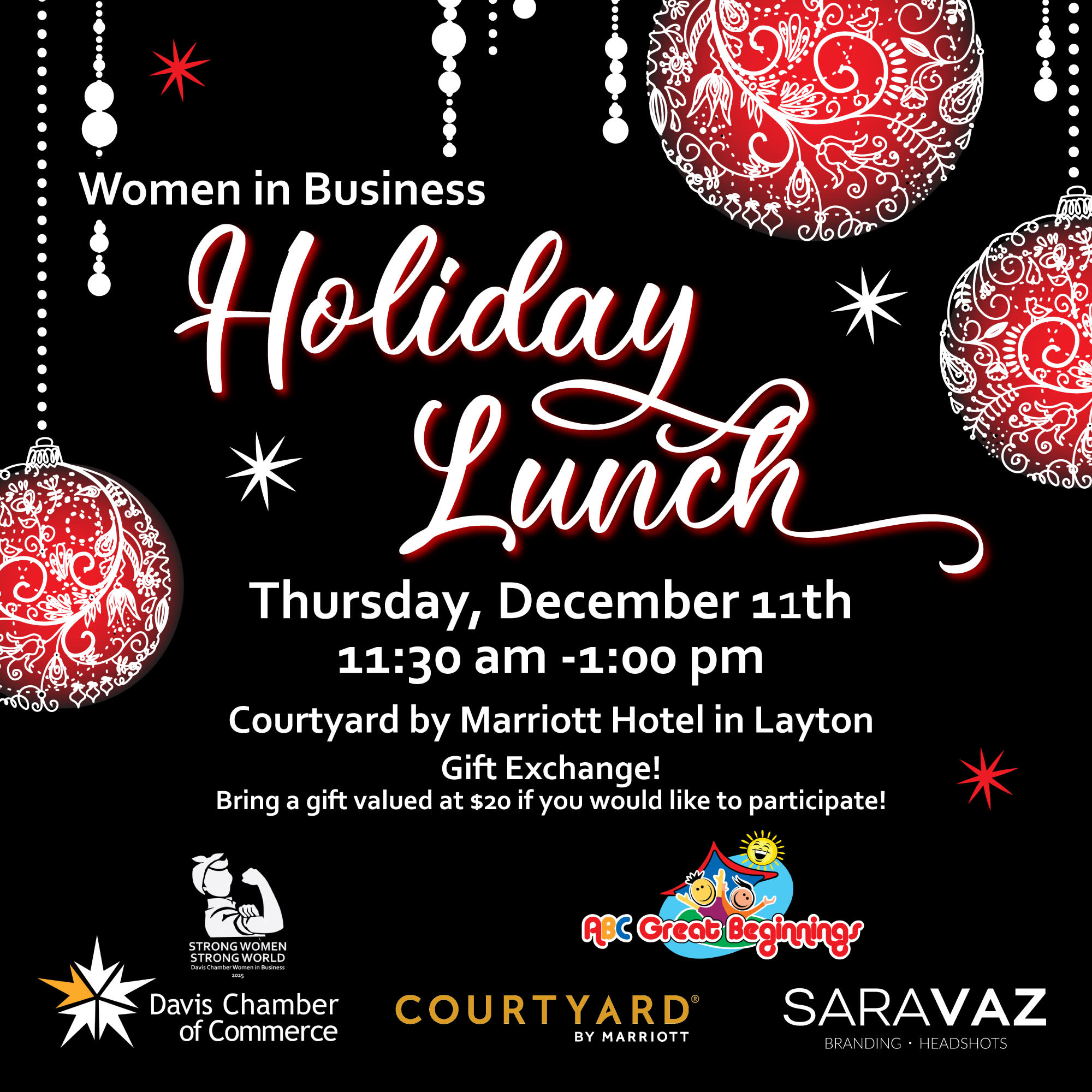 Join us for a fabulous Holiday Party with Davis Chamber Women in Business Group! Wear your holiday attire to celebrate the holidays and enjoy a holiday lunch, gifts, and a special guest! To participate in the gift exchange, please bring a gift valued at $20.