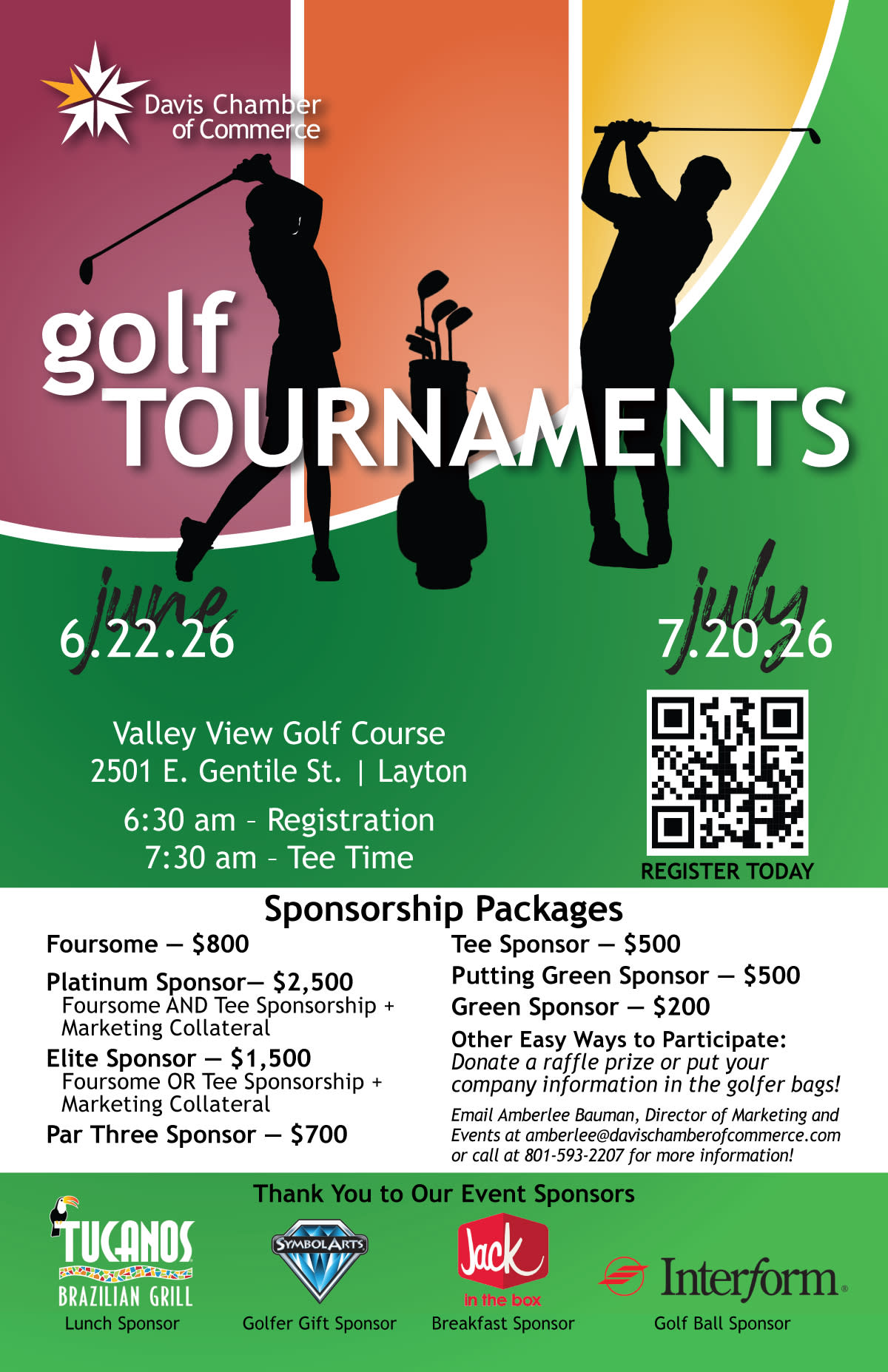 Not interested in golfing? You can still get all eyes on your business at our golf tournament, or generate new business, by donating a raffle prize. All Sponsors are asked to bring a gift of $100 or more in value for the golf raffle.If you're interested in being a sponsor, butting swag in our golfer bags or donating a raffle prize, call Amberlee at 801-593-2207 or email Amberlee@davischamberofcommerce.com.