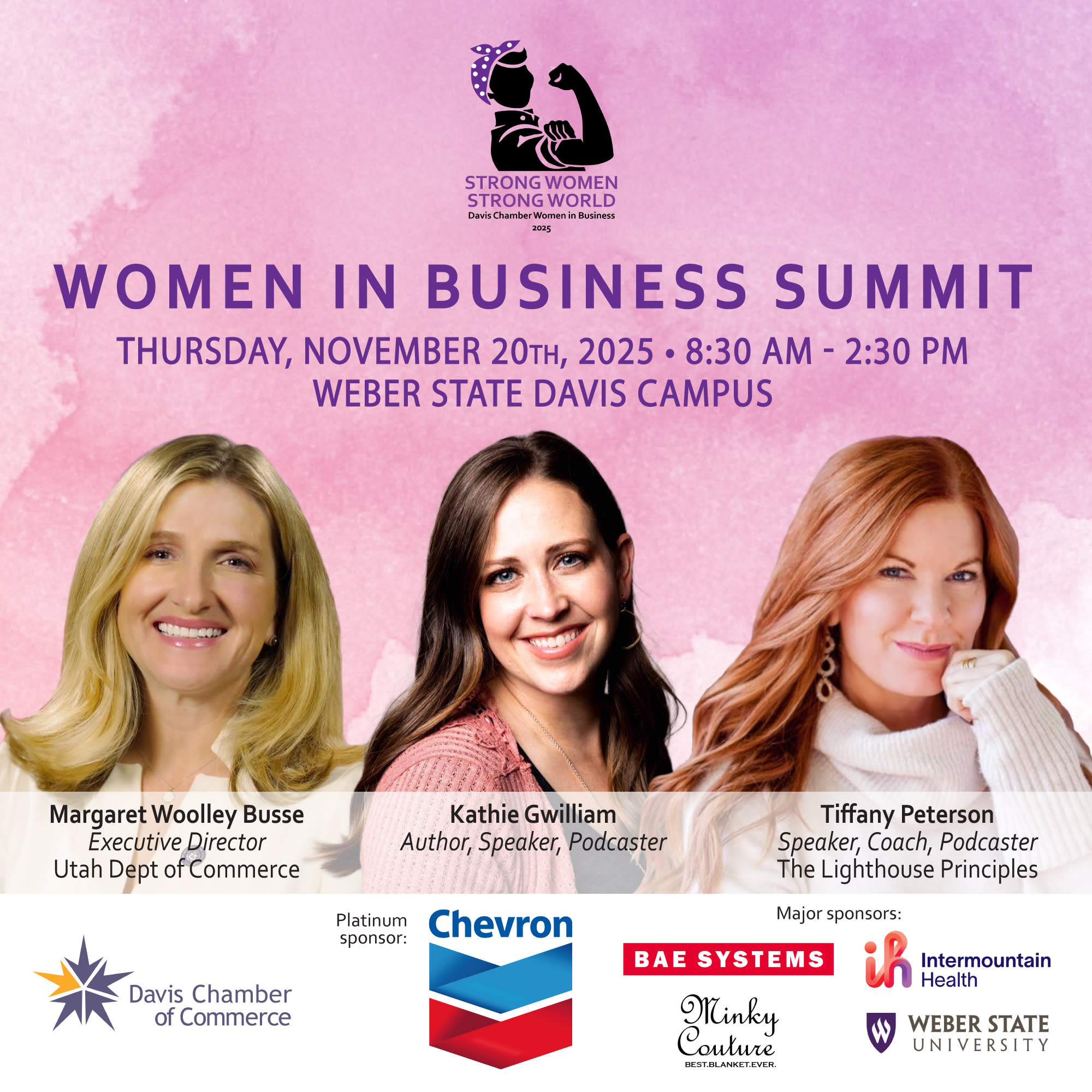 If you are interested in sponsoring this premier Women in Business event, contact Amberlee Bauman at Amberlee@davischamberofcommerce.com or 801-593-2207. Or scroll up on this page and click REGISTER, choose the sponsorship level you would like, and complete the online registration process.