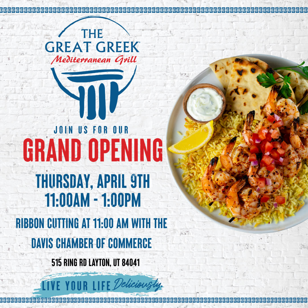 The Great Greek Ribbon Cutting Join us in welcoming The Great Greek Mediterranean Grill to Layton! Celebrate the grand opening with a ribbon-cutting ceremony and then head inside to enjoy delicious Greek samples and refreshments. Meet the team and experience the fresh flavors and hospitality that make The Great Greek a favorite.